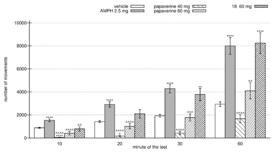 Effects of papaverine and compound 18 on d-amphetamine-induced hyperlocomotor activity in CD-1 mice. Data are expressed as the mean of the number of movements recorded after 10, 20, 30, and 60 min of the papaverine-treated groups (at doses of 40 and 60 mg, respectively) and the compound 18-treated group (at a dose of 60 mg) ± S.E.M. * p < 0.05, ** p < 0.01, **** p < 0.0001, versus the respective vehicle-treated group, ^^ p < 0.01, ^^^ p < 0.001, ^^^^ p < 0.0001, and versus the respective AMPH-treated group (one way ANOVA followed by Bonferroni’s post-hoc test). AMPH-d-amphetamine.