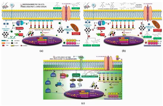 For the inflammasome activation, danger signals such as Damage-Associated Molecular Patterns (DAMPs) or Pathogen-Associated Molecular Patterns (PAMPs) bind to PRRs on the cell membrane and trigger the activation of a signaling cascade, which includes the activation of NF-κB, MAPK and MAPK activating protein kinase (MEK), leading to activation and assembly of the inflammasome, a protein complex where active caspase-1 catalyzes the cleavage and secretion of IL-1β and IL-18, important pro- inflammatory signaling gents. In this context, flavonoids cross the membrane through passive or facilitated diffusion using membrane-bound transport proteins. In the cell, different flavonoids act in the same pathway or in different pathways, blocking the formation of inflammasome and consequently inhibiting the inflammatory process (Figure 1c) [54].