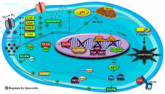 Antioxidant effect of quercetin on enzyme activity, signal transduction pathways and reactive oxygen species (ROS). Several conditions and environmental factors can increase ROS production. Besides, the mitochondrial electron transport chain is an important source of intracellular ROS generation. Flavonoid uptake occurs either via passive diffusion through cell membrane, or through membrane bound transport proteins [54]. After entering the cell, quercetin acts through the regulation of the enzyme-mediated antioxidant defense system and the non-enzymatic antioxidant defense system. Nuclear factor erythroid 2–related factor 2 (NRF2), AMP-activated protein kinase (AMPK), and mitogen-activated protein kinase (MAPK) pathways induced by ROS to promote the antioxidant defense system and maintain oxidative balance can also be regulated by phenolic compounds such as quercetin [59]. Through the neutralizing effect of ROS, quercetin can develop important anti-inflammatory effect due to inhibition of the Nuclear Factor-kappa B (NF-KB) pathway, preventing the activation of NRLP3 inflammasome (shown in Figure 1B). Through the p53 pathway, ROS induce apoptotic events. Therefore, quercetin can prevent apoptosis induced by excess ROS. In addition, it enhances the production of Apurinic/apyrimidinic Endonuclease 1/ Redox Effector Factor 1 (APE1/Ref1), activation of various signaling events and the NF-E2-related factor (NRF2)-mediated activation of genes, containing antioxidant response elements (ARE) and NF-κB [60,61,62,63,64]. AMPK, AMP-activated protein kinase; AP-1, activator protein 1; APE1, Apurinic/apyrimidinic endonuclease 1; ARE, antioxidant response element; Bax, BCL2 Associated X; CAT, catalase; CREB, cAMP-response element binding protein; EGR1, Early Growth Response 1; ERK, Extracellular signal-regulated kinase; GSH, glutathione; GSHPx, Glutathione peroxidase; IκB, κB inhibitor; JNK, c-Jun N-terminal Kinase; KEAP1, Kelch-like ECH-associated protein 1; Maf, musculoaponeurotic fibrosarcoma; MAPK, mitogen-activated protein kinase; MtROS, Mitochondrial ROS; NF-ΚB, Nuclear Factor-kappa B; Nrf2, nuclear factor erythroid 2–related factor 2; PDGFR, Platelet-derived growth factor receptors; PI3K, phosphatidylinositol-3-kinase; Ref-1, redox effector factor 1; ROS, reactive oxygen species; SOD, Superoxide dismutase.