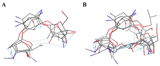 Flexible alignment with carbon atoms in gray, oxygen atoms in red, and nitrogen atoms in blue. (A) Compounds 1–4 in Cluster A, (B) compounds 1–7 in Cluster B.