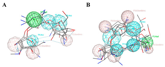 The pharmacophore models created using the pharmacophore centers donor/acceptor (Don/Acc), acceptor (Acc), and hydrophobic (Hyd), represented by pink, blue, and green, respectively. (A) Cluster A, (B) Cluster B.
