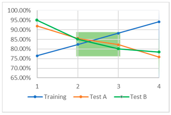 Models 2 and 3 are the most balanced, demonstrating accuracies in the mid 80% range for all three datasets. Figure 3 illustrates that these two balanced models fall between the other two developed in TF; they occupy the ML “goldilocks zone” (green box), illustrating the region in which under fitting and over fitting are minimized. Model 2 is slightly under fitting, because the testing set accuracy is slightly higher than that of the training set. Model 3 is the opposite, slightly over trained, as the training accuracy exceeds that of both testing sets.