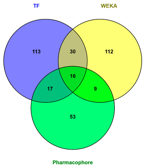 Overlap between molecules predicted to be active on the target proteins by different methods—pharmacophore-based and machine learning (ML) and deep learning (DL)-based. The three methods agree on 16 molecules. The largest overlap between two methods are the 46 molecules predicted to be active by both models developed in TensorFlow and WEKA.