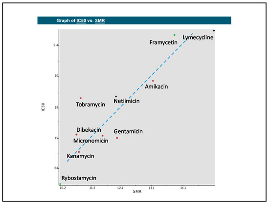 We developed QSAR models for 10 of the 16 consensus drugs selected by pharmacophore-based, WEKA-based and TensorFlow-based searches of the FDA-approved drug database that have the same target (30S ribosome) (see Supplementary Materials). We elucidated the QSAR descriptors most useful to our modeling problem to analyze their relation to inhibitory activity on the 30S ribosome. Molecular refractivity (including implicit hydrogens)—SMR—proved to be most suitable for this comparison, displaying the strongest linear relationship to IC50 for these compounds (Figure 5) [36].