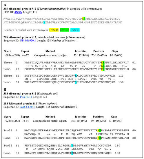 (A) Alignment of the 30S ribosomal protein S12 of Thermus thermophilus and the 28S ribosomal protein of Homo sapiens. (B) Alignment of the 30S ribosomal protein S12 of Escherichia coli with the 28S ribosomal protein S12 of Homo sapiens.