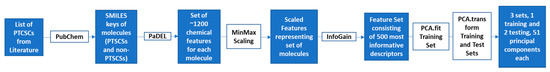 SMILES (simplified molecular-input line-entry system) representations of all molecules were collected from PubChem and used to compute QSAR molecular descriptors and fingerprints using the PaDEL online descriptor calculator [48]. Descriptors for the training set were uploaded to WEKA (Waikato Environment for Knowledge Analysis, University of Waikato, New Zealand) [49] and ranked by Information Gain (IG) with respect to the label of active/inactive. The 500 most informative columns were kept and ranked. The same 500 descriptors were isolated for the two testing sets. All three sets were MinMax scaled (Equation (1)), using the minimum and maximum values of each column presented in the training set.