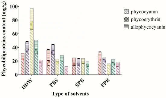 The solvents (double distilled water, DDW; phosphate buffer saline, PBS; sodium phosphate buffer, SPB and potassium phosphate buffer, PPB) in the present study were able to extract at least 10 mg/g total phycobiliproteins from cyanobacteria (Figure 1). Solvent types and their pH were found to contribute significantly to the extraction yield of total phycobiliproteins content (p < 0.05). Comparatively, extraction using double distilled water with pH 7 yielded the highest total phycobiliproteins (97.08 ± 8.26 mg/g) from Arthrospira sp. compared to the other solvents (p < 0.05). In addition, this extraction also produced the highest concentration of phycocyanin, PC (66.39 ± 0.03 mg/g); phycoerythrin, PE (11.98 ± 0.11 mg/g) and allophycocyanin, APC (18.71 ± 0.17 mg/g) among the tested solvents.