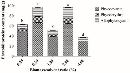 Extractions of phycobiliproteins content from Arthrospira sp. (UPMC-A0087) using different biomass solvent ratios. Values annotated with different letters indicate a statistically significant difference (p < 0.05) in terms of total phycobiliproteins among the tested parameter.