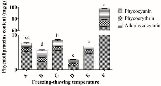 Extractions of phycobiliproteins content of Arthrospira sp. (UPMC-A0087) using different freezing–thawing temperatures. A: freezing at 0 °C, thawing at 4 °C; B: freezing at 0 °C, thawing at 25 °C; C: freezing at −30 °C, thawing at 25 °C; D: freezing at −30 °C, thawing at 4 °C; E: freezing at −80 °C, thawing at 4 °C; F: freezing at −80 °C, thawing at 25 °C. Values annotated with different letters indicate a statistically significant difference (p < 0.05) in terms of total phycobiliproteins among the tested parameters.