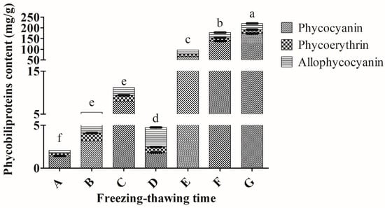 Extractions of phycobiliproteins from Arthrospira sp. (UPMC-A0087) using different freezing–thawing times. A: freezing for 0.5 h–thawing for 1 h; B: freezing for 0.5 h–thawing for 1.5 h; C: freezing for 0.5 h–thawing for 2 h; D: freezing for 1 h–thawing for 2 h; E: freezing for 2 h–thawing for 2 h; F: freezing for 2 h–thawing for 12 h; G: freezing for 2 h–thawing for 24 h. Values annotated with different letters indicate a statistically significant difference (p < 0.05) in terms of total phycobiliproteins among the tested parameters.