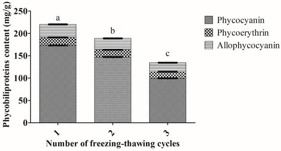 Extractions of phycobiliproteins content from Arthrospira sp. (UPMC-A0087) using different number of freezing–thawing cycles. Values annotated with different letters indicate a statistically significant difference (p < 0.05) in terms of total phycobiliproteins among the tested parameters.