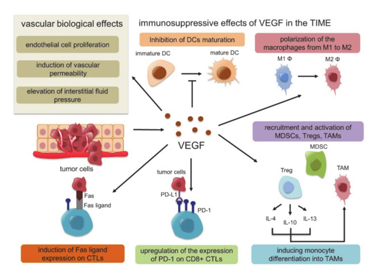 In this response triggered by hypoxia, hypoxia-inducible factor 1 (HIF-1) plays a key role. HIF-1 is a dimeric protein composed of two subunits expressed in the cells, the oxygen-sensitive α-subunit, HIF-1α, and a constitutively expressed β-subunit, HIF-1β [53,54]. At normal oxygen concentrations, prolyl hydroxylase domain-2 (PHD-2), which is the HIF proline hydroxylase enzyme, generates hydroxyl groups from oxygen molecules and adds them to the Pro402 and Pro564 residues of HIF-1α. Subsequently, von Hippel-Lindau (VHL) E3 ubiquitin ligase binds to HIF-1α, whose proline residue is hydroxylated, resulting in rapid degradation. Under hypoxic conditions, however, the activity of PHD-2 is low, and PHD-2 cannot bind and degrade HIF-1α. Activated HIF-1α translocates to the nucleus, interacts with the HIF-1β subunit, and binds to the promoter regions of various genes that are involved in the hypoxia response, such as angiogenesis, cell proliferation, glucose metabolism and macrophage polarization into TAMs, resulting in the suppression of innate and adaptive antitumor immune responses [55,56,57] (Figure 1). In this HIF1-related signal, VEGF is strongly associated with these genes identified as the transcriptional target of HIF-1, and several studies have shown functional cross-talk among regulatory T cells (Tregs), TAMs, and MDSCs [58]. VEGF is the most potent endothelial-specific mitogen that recruits endothelial cells into hypoxic and avascular areas and stimulates their proliferation [59]. Therefore, VEGF has not only vascular biological effects, including endothelial cell proliferation, induction of vascular permeability and elevation of interstitial fluid pressure but also several immunological effects in the TIME, such as inhibition of dendritic cell maturation resulting in the inactivation of CTLs, recruitment of Tregs, MDSCs and TAMs, the polarization of macrophages from M1 to M2, upregulation of the expression of PD-1 on CD8+ CTLs and Tregs via VEGFR2-dependent signals and induction of Fas ligand expression leading to CTL exhaustion [60,61,62,63,64]. In addition, Tregs themselves produce IL-4, IL-10, and IL-13, inducing monocyte differentiation into TAMs [65] (Figure 2). Because of these immunosuppressive effects of VEGF in the TIME, antiangiogenic therapy targeting VEGF signaling has the possibility to convert “cold” tumors into “hot” tumors with a favorable microenvironment. Additionally, the combination therapy of ICIs and tumor angiogenesis inhibitors seems very reasonable considering the above TIME changes.