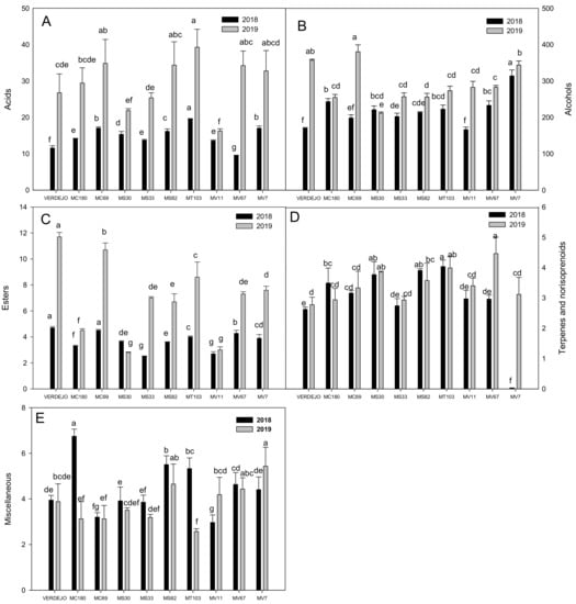The total concentration of the different families of aromas during the two years studied are shown in Figure 1. It can be difference between acids (A), alcohols (B), esters (C), terpenes and norisoprenoids (D), and miscellaneous (E).