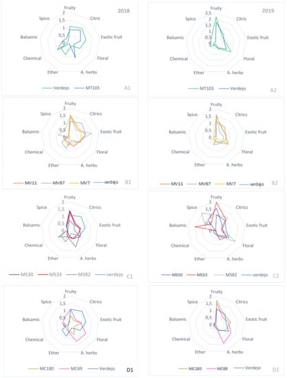 In Figure 2A, Verdejo wine is compared with the MT103 wine in both years (1 and 2, respectively). In 2018, the MT103 wine was considered by tasters to be a citric wine, with notes of aromatic herbs and some aromas of the chemical series, like alcohol or solvent, and less aromatic than Verdejo (Figure 2A1). However, in 2019, this wine was defined as being more aromatically complex, with stronger notes of fruits (apricot and peach), which may have been related with the ethyl ester concentrations resulting from the earlier harvest and lower Brix than in 2018. Furthermore, lemon or orange citric notes and some floral characteristics (jasmine) (Figure 2A2) added to the improvement in the aromatic composition compared with Verdejo during this last year.