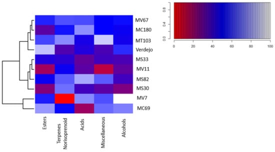 In addition, our results showed how esters, followed by alcohols, were the aromatic groups with most weight in the heat map analysis in Verdejo wine, while MT103 was characterized by its acidity, and terpene and norisoprenoid groups; MC180 by its miscellaneous aromas, and finally MV67 by the same group but also terpenes and norisoprenoids. It is necessary to emphasize the importance of the weight of each aromatic group. According to Vilanova et al. [65], wine quality is closely related with overall aroma and therefore with the wine volatile composition responsible for these aromas. Our study of the volatile composition of wines and their sensory analysis will contribute to improving knowledge of what makes a quality wine.