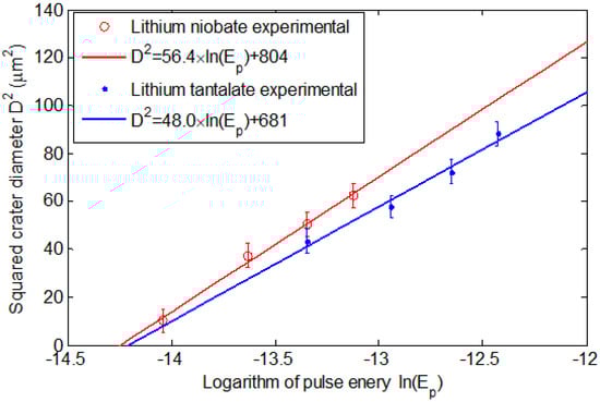 The evolution of the crater diameter as the pulse energy is varied near the ablation threshold is shown for both lithium niobate and lithium tantalate in Figure 2, with the square of the diameter plotted against the logarithm of the pulse energy plotted consistent with Equation (2). The experimental data suggest a beam waist of w0 ≈ 4.8–5 μm (1/e2 diameter of 9.6–10 μm) and corresponding threshold fluence of 1.46 J/cm2 for lithium niobate and 1.80 J/cm2 for lithium tantalate, which is consistent with the results of Zhang et al. [28].