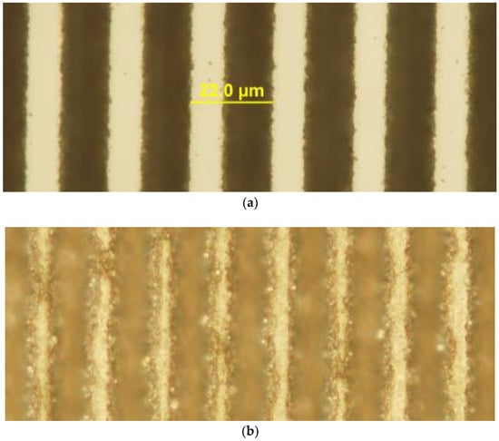 The fluence appropriate for producing high quality trenches on the crystal surface was determined empirically by visual inspection of the trenches after laser machining. It was found that a 2 mW average power, corresponding to a fluence of ~6.2 J/cm2 was sufficient to produce high quality features. Increasing the power to 3 mW (9.5 J/cm2) had an adverse effect on the quality of features with a marked increase in edge chipping and debris. Optical micrographs (Olympus BX 61, Sydney, Australia) of typical arrays of trenches machined at these two fluences are shown for comparison in Figure 3.