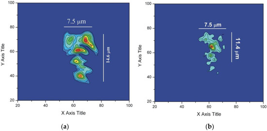 Experimentally this relationship is used to determine the beam waist on target and the pulse energy required for ablation from the slope (2w02) and intercept (ln(Ithreshold)) respectively, of Equation (2). Measurements of the “single shot” crater diameters and depths for various pulse energies were carried out using optical profilometry (Veeco NT3300, Bruker Nano Surface, Tucson, AZ, USA). A typical optical profile measurement is shown in Figure 1 with both a 3D visualization and 2D cross-sectional representation of the data.