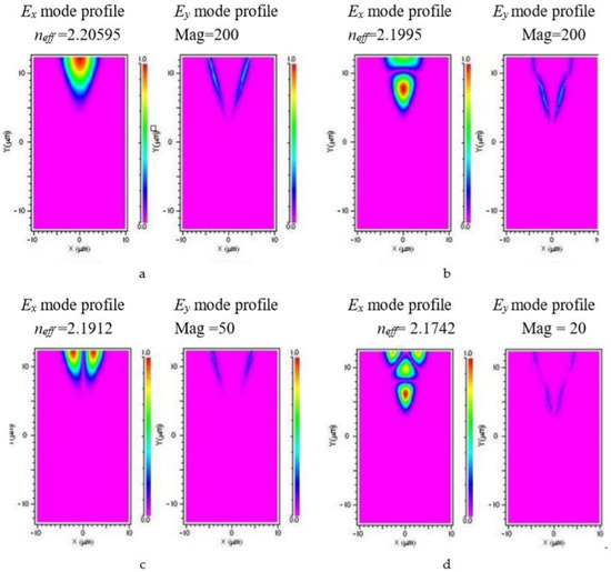 (a–d). Calculated Ex and Ey mode profiles for lithium niobate channel waveguides on lithium tantalate substrates showing that the y-component of the electric field is negligible. The Ey mode profile is proportionally scaled for each profile by (a) 200×, (b) 100×, (c) 50×, and (d) 20× magnification respectively. The vertical and horizontal axes are marked in μm. The neff values are: (a) 2.2059, (b) 2.1995, (c) 2.1912, and (d) 2.1742 respectively.