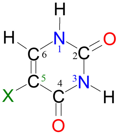 In the current study, we concentrate on uracil, a small elementary building brick of DNA—a macromolecular structure involved in “information transfer” in living systems. In this work, we will also shortly discuss its 5-halogeno derivatives (Figure 1).
