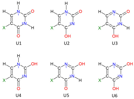 On the basis of theoretical and experimental studies, there is a general agreement that out of six possible tautomers, the diketo form (5XU1) is the most stable (Figure 2). Because of the very large energy difference between the most stable U1 structure and the remaining forms (10–20 kcal/mol), in most experiments only one tautomer is observed [22,33,39,45,46,47]. Thus, the presence of “rare” or high energy forms is very difficult to measure. IR studies in Ar-matrix suggested that the other, “rare” tautomers could not exist in concentrations above 0.1% [45,48]. Moreover, NMR [39], as well as photoluminescence measurements [49], were unable to detect any other than the diketo tautomer of uracil and its derivatives. However, for years it was speculated that perturbations in DNA replications could be due to the presence of “rare” or ionized nucleobases [50]. Unfortunately, there was no explanation about the reason for the predominant stability of the diketo tautomer.