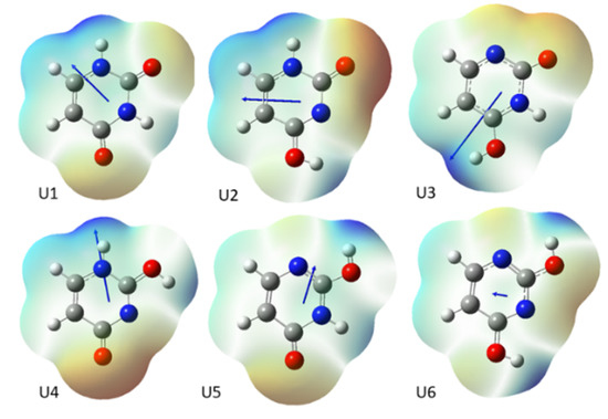 In a polar environment, modelled by PCM method, the dipole moment of the studied molecules increased by 0.03 to 3.33 D. Tautomers 6 of all uracil derivatives show the lowest dipole moments in vacuum and water induces the smallest increase in their dipole moments. On the contrary, the largest calculated dipole moments are observed for tautomers 3 and 4 (see Table 1). Obviously, for these tautomers, one could notice the strongest impact of polar solvent on their dipole moments. The directions of the dipole moment vectors of uracil tautomers and the maps of electrostatic potential around these molecules are shown in Figure 3.