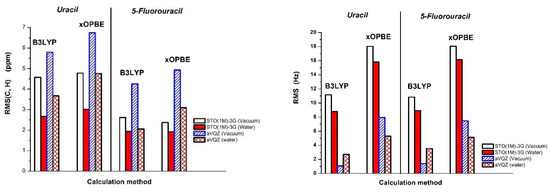 In the case of heterocyclic compounds, the prediction of chemical shifts could be quite challenging. As can be seen from the data collected in Table 3, both density functionals, B3LYP and xOPBE, are able to fairly accurately predict chemical shifts of uracil with RMS (C, H) below 7 and 5 ppm in vacuum and water, respectively (see Figure 4 Left). Interestingly, a small and compact STO(1M)−3G basis set, specially designed for calculation of magnetic shieldings, performs very well (RMS (C, H) of 2.7 and 3.0 ppm) in comparison to the very expensive aug-cc-pVQZ one. The importance of the inclusion of the solvent effect is also apparent from Table 3. The PCM approach, though very simplified, produces nearly two times better agreement between the predicted 13C and 1H chemical shifts and the experiment. The presence of the solvent effect also improves the quality of 17O chemical shifts and only xOPBE/STO(1M)−3G produces worse agreement with the experiment in water. On the contrary, for all studied theory levels, the 15N chemical shifts calculated in water are less accurate than for uracil in the gas phase. However, one should notice that in the case of 17O and 15N NMR, no experimental data in water are available.
