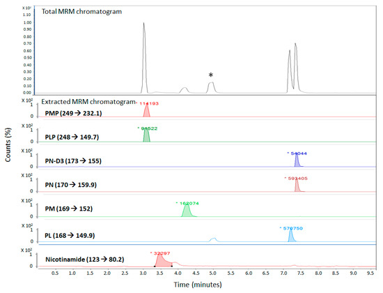 These parameters were then used to develop a short, 10-min, LC-MS/MS-based chromatographic method (described more under Materials and Methods) that was able to quantify the five different B6 vitamers, nicotinamide, and an internal standard (pyridoxine hydrochloride (PN)-D3).