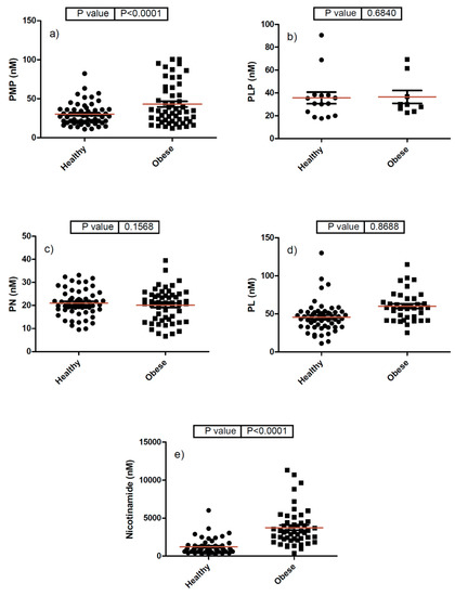 Comparative analysis of various B6 vitamers and B3 (nicotinamide) in healthy and obese Emirati populations (panels (a–e)) refer to PMP, PLP, PN, PL, and nicotinamide, respectively.