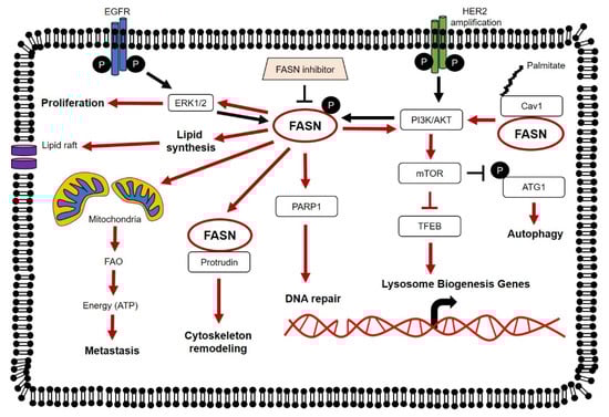 Molecular mechanisms of FASN in cancer. Expression and activity of FASN can be regulated by the epidermal growth factor receptor (EGFR) family members, EGFR and epidermal growth factor receptor 2 (HER2). FASN is shown to regulate lipid synthesis, signaling of major oncogenic pathways (including phosphatidylinositol-3′-kinase (PI3K/AKT) and extracellular regulated kinase 1/2 (ERK1/2)) and modulate cellular mechanisms (including autophagy, DNA repair and transcription of Lysosome Biogenesis genes). FASN overexpression promotes proliferation and increases the metastatic potential of tumor cells.