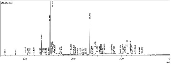 The GC-MS analysis was evaluated using a model 7890A capillary gas chromatography along with a mass spectrometer (Agilent Technologies, Santa Clara, CA, USA). The column was a fused silica capillary column of 95% dimethyl-poly siloxane and 5% phenyl (HP-5MSI; length: 90 m, diameter: 0.250 mm and film: 0.25 µm, Merck, Darmstadt, Germany). Parameters for GC-MS detection were an injector temperature of 250 °C, and the initial oven temperature of 90 °C was gradually raised to 200 °C at a speed of 3 °C/min for 2 min and with a final increase to 280 °C at 15 °C/min for 2 min. The total GC-MS run time was 36 min, using 99.999% helium as a carrier gas, at a column flow rate of 1 mL/min. The GC to MS interface temperature was fixed at 280 °C, and an electron ionization system was set on the MS in scan mode. The mass range evaluated was 50–550 m/z, where MS quad and source temperatures were maintained at 150 °C and 230 °C, respectively. The NIST-MS Library 2009 was used to search and identify each component, and to measure the relative percentage of each compound, relative peak areas of the TIC (total ionic chromatogram) were used, with calculations performed automatically.
