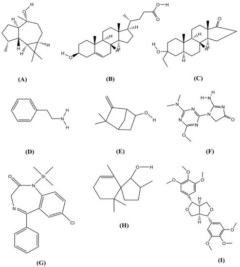 Chemical structure of (A) (−)-Globulol; (B) 3.beta-Hydroxy-5-cholen-24-oic acid; (C) Androstan-17-one, 3-ethyl-3-hydroxy-, 5; (D) Benzeneethanamine; (E) Camphenol; (F) Imidazolidin-4-one, 2-imino-1-(4-methoxy-6-dimethylamino-1,3,5-triazin-2-yl); (G) Nordazepam, TMS derivative; (H) Spiro[4,5]dec-6-en-1-ol, 2,6,10,10-tetramethyl; (I) Yangambin (structures are drawn using ChemDraw Professional version 16).