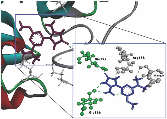 Molecular docking interaction between the SARS-CoV-2 Mpro and imidazolidin-4-one, 2-imino-1-(4-methoxy-6-dimethylamino-1,3,5-triazin-2-yl). The ligand in the active site is shown in purple color and the ligand interacting with the residues is shown in blue color, green color illustrates the residues forming hydrogen bonds, and white color illustrates the residues with carbon–hydrogen interaction.