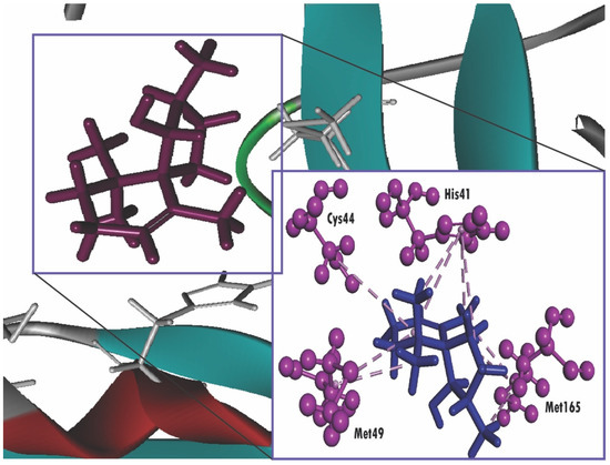 Molecular docking interaction between the SARS-CoV-2 Mpro and spiro[4,5]dec-6-en-1-ol, 2,6,10,10-tetramethyl. Ligand in the active site is shown in purple color, and ligand interacting with the residues are shown in blue color, pink color illustrated the residues with hydrophobic (pi-pi/pi-alkyl) stacking.
