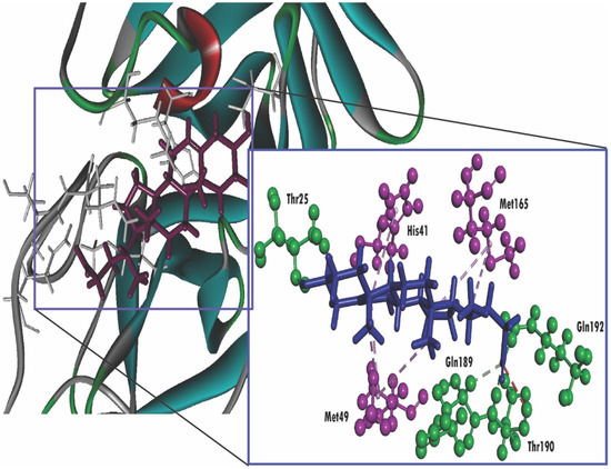 Using the CASTp server, we sought to identify the active pockets of the PDB protein. The area was depicted as 304.266, and the volume was 296.682. A total of 27 active site residues were identified by CASTp server, and the residues were Thr25, Thr26, Leu27, His41, Cys44, Thr45, Ser46, Met49, Pro52, Tyr54, Phe140, Leu141, Asn142, Gly143, Ser144, His163, His164, Met165, Glu166, Leu167, Pro168, His172, Asp187, Arg188, Gln189, Thr190, and Gln192.
