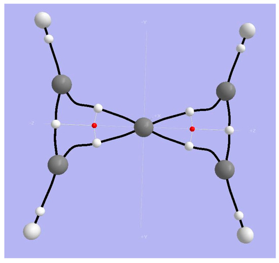 Firme et al. [41,42] presented an AIM analysis of the planar dication of spiropentadiene. Critical points and bond paths from our AIM2000 analysis of the density obtained with ωB97XD/cc-pVTZ are shown in Figure 5. Values of density, the Laplacian, G and V at selected BCPs are shown in Table 1. Entries in red are from Firme, et al. [41] and agree pretty nearly with our ωB97XD/cc-pVTZ values. We see that the BCPs along the paths from a peripheral Carbon to the tetracoordinate planar Carbon have much smaller values of the Laplacian of the density compared with the values at BCPs along the two bond paths connecting peripheral C-Cs. We infer that the tpC-Cx bond is weaker than the Cx-Cx bond. It is remarkable that the tpC is has a net negative AIM basin charge (−0.193 absolute electrons or |e|); the positive charge in this dication is dispersed to the surrounding C and H atoms (+0.169 and +0.379 |e| respectively.)