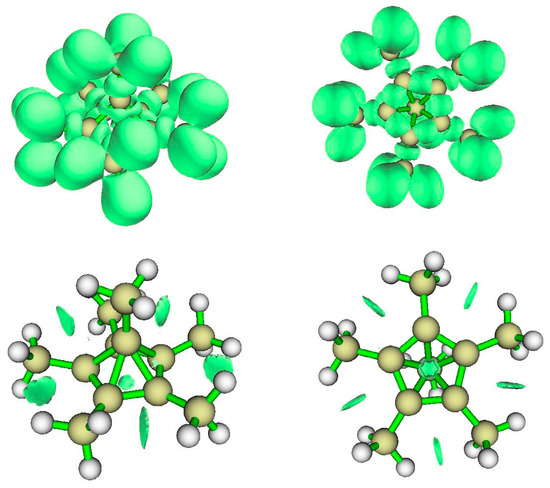 Figure 8 displays the electron localization function (ELF) surface from an elevation toward a face of the pentagonal pyramid (top left) and a view from the pentagonal base (top right). The former view reveals a bond connecting the apical carbon to the carbon of its methyl, and the region of the bonding around the carbon five membered ring. The latter view shows base CC bonds, bonds from those base-plane Carbons to their methyl carbons, and the visible portions of the associated CH bonds. The apical C atom is visible in the center.
