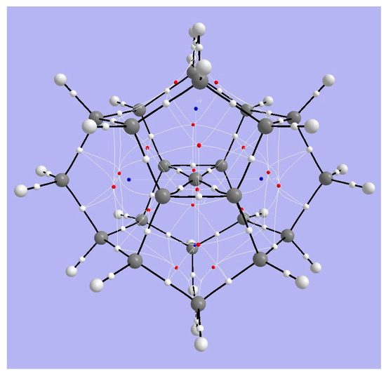 Topological analysis of Radom’s dimethanospiro[2.2]octaplane 3. Large light-gray spheres = H atoms; large dark gray spheres = C atoms; small white spheres = Bond CPs; small red spheres = Ring CPs; small blue spheres = Cage CPs; black lines = bond paths.