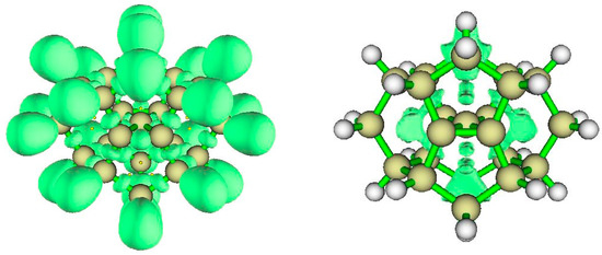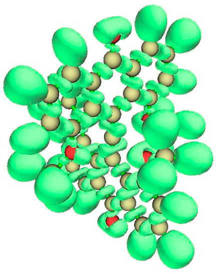 The plot of the reduced density gradient (RDG) s(ρ) vs. the signed density (Supplementary Materials) shows van der Waals features and also strongly repulsive interaction. The NCI zones shown in Figure 10 (right) lie at cage critical points and between the >CH2 bridges of the cyclooctane fragments at top and bottom of the structure. Curious NCI zones appear above and below the CC4 central plane.