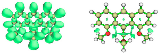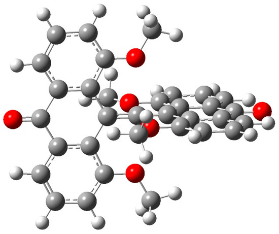 The NCI zones displayed in Figure 19 include interactions between the bridging >C=O groups and ipso CH groups of the anthryl fragments, destabilized regions within six-membered rings, and interactions between -OCH3 methyl groups and nearby CH groups of the anthryl frame. Most significant for our purpose are noncovalent interactions between -OCH3 and the allenyl group’s central hexacoordinated carbon.
