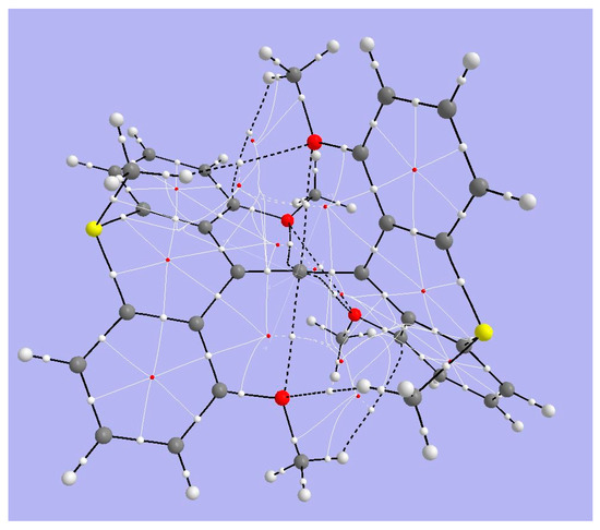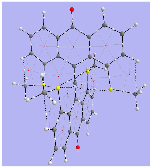 Since the behavior of this structure is complex, we address only a few details of its topology. Figure 15 displays the results of topological analysis of Yamaguchi’s system, in its crystal geometry. As seen in earlier examples, bond critical points appear on bond paths (heavy black lines) corresponding to links in the molecular drawing. Ring critical points (in red) are found within each of the aromatic rings of the anthryl fragments. Fine white lines connect RCPs and BCPs. Heavy broken lines represent weaker interactions. The four methoxy oxygens are linked by such lines to the central hexacoordinate C. We also observe heavy broken lines connecting the methoxy oxygen atoms with H atoms of the thiomethyl bridging groups, among other surprising connections.