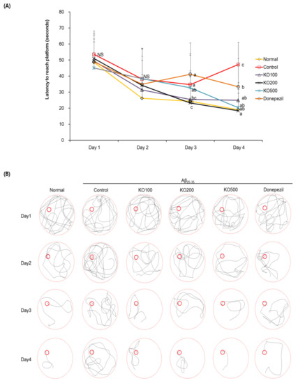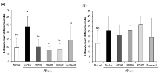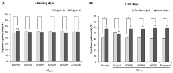 Novel object recognition test. (A) The percentage of time exploring of the identical two objects in the training day. (B) The percentage of time exploring of the familiar and novel object in the test day. Normal, injection of saline solution + oral administration of water; Control, injection of Aβ25–35 + oral administration of water; KO100, injection of Aβ25–35 + oral administration of KO at 100 mg/kg/day; KO200, injection of Aβ25–35 + oral administration of KO at 200 mg/kg/day; KO500, injection of Aβ25–35 + oral administration of KO at 500 mg/kg/day; Donepezil, injection of Aβ25–35 + oral administration of donepezil at 5 mg/kg/day. Values are represented as means ± SD (n = 8). * The object cognitive abilities for familiar and novel objects are significantly different as determined by Student’s t-test (p < 0.05). a,b Means with the different letters are significantly different (p < 0.05) by Duncan’s multiple range test. NS, non-significance.