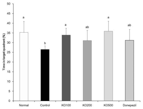 To evaluate the learning and memory abilities of KO, we carried out a Morris water maze test. In this result, the injection of Aβ25–35 deteriorated the learning and memory abilities by showing longer time to find latency the hidden platform. However, administration of KO showed shorter time to find latency the hidden platform, indicating improvement of learning and memory abilities of KO. In addition, Aβ25–35-injected control mice showed shorter latency to the target area where the hidden platform was placed, compared with normal mouse. On the other hand, KO-administered group showed longer latency to target area, compared with Aβ25–35-induced control group. In addition, the time to reach the exposed platform was not significantly different among the all groups, indicating that learning and memory abilities are not involved in swimming or visual abilities. As shown in Figure 7B, the time to reach the exposed platform was not significantly different among all groups, indicating that learning and memory abilities are not involved in swimming or visual abilities. Previous studies reported that visible platform trial did not show different escape latency between the normal group and AD mouse, indicating that the groups have similar visual capabilities among groups [34,35].