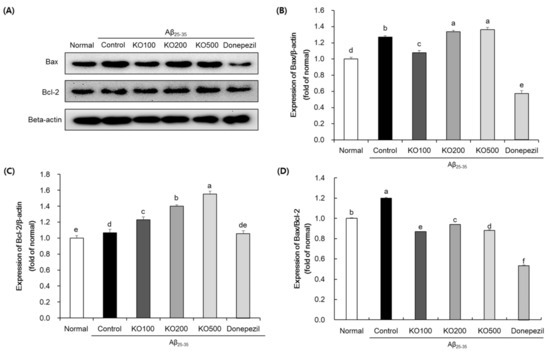 Effects of krill oil (KO) on Bax and Bcl-2 protein expressions in the brain. Western blot band (A), Bax (B), Bcl-2 (C), and Bax/Bcl-2 ratio (D). Normal, injection of saline solution + oral administration of water; Control, injection of Aβ25–35 + oral administration of water; KO100, injection of Aβ25–35 + oral administration of KO at 100 mg/kg/day; KO200, injection of Aβ25–35 + oral administration of KO at 200 mg/kg/day; KO500, injection of Aβ25–35 + oral administration of KO at 500 mg/kg/day; Donepezil, injection of Aβ25–35 + oral administration of donepezil at 5 mg/kg/day. Values are represented as means ± SD (n = 8). a–f Means with the different letters are significantly different (p < 0.05) by Duncan’s multiple range test. d,e Means with the same letters such as d and e are not significantly different (p < 0.05) by Duncan’s multiple range test. β-actin was used as a loading control.