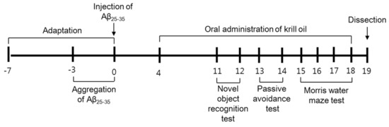 Krill oil (KO) is extracted from Antarctic krill (Euphausia superba) which is a small marine crustacean found in the Antarctic Ocean [10]. The KO contains essential n-3 polyunsaturated fatty acids (PUFAs) such as docosahextanoic acid (DHA) and eicosapentaenoic acid (EPA) [10,11]. In addition, n-3 PUFAs in KO are incorporated into phospholipids, mainly phosphatidylcholine (PC), which increases the bioavailability with higher absorption rate than fish oil [12]. Astaxanthin is a marine-derived natural antioxidant also mainly found in KO [13]. Therefore, these characteristics of KO such as high contents of n-3 PUFAs, PC, and astaxanthin suggest various health beneficial activities. Previous studies have reported health benefits of KO such as anti-hyperlipidemia, anti-inflammation, and anti-arthritis effects [14,15,16]. Several studies also demonstrated that neuroprotective and cognitive improvement effect of KO. The administration of KO improved cognitive function in d-galactose-induced cognitive impairment mice and age-related SAMP8 mice by regulation of oxidative stress, proteomic changes, and Aβ deposition [17,18]. However, the protective effect of KO on cognitive impairment by regulation of neuronal oxidative stress and neuronal apoptosis in Aβ-induced AD mouse model has not been reported.