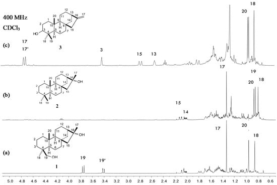 1H NMR spectra of phyllocladanes: (a) phyllocladan-16α,19-diol (1), (b) phyllocladan-16α-ol (2), and phylloclad-16-en-3-ol (3) (c).
