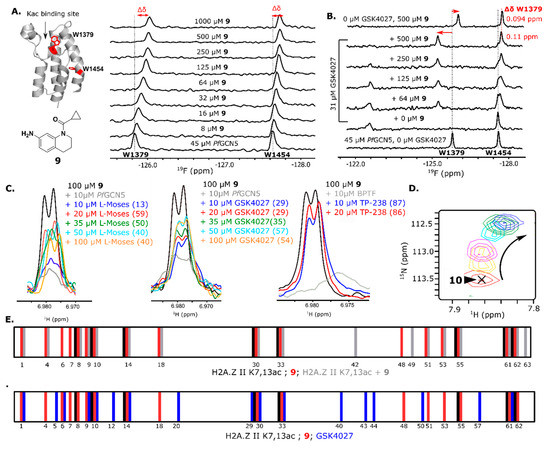 The competition 1H CPMG NMR and PrOF NMR assays were employed to further probe the binding mode of 9 to PfGCN5. L-Moses, a potent PCAF/PfGCN5 inhibitor (Kd PfGCN5 = 280 nM [46]), GSK4027, a BPTF/GCN5/PCAF inhibitor [53], and TP-238, a CECR2/BPTF chemical probe [54], were used as competitive molecules. Crystal structures of L-Moses with PfGCN5 (PDB 5TPX), GSK4027 with GCN5 (PDB 5MLJ), and TP-238 with BPTF [51] show these compounds bind the native Kac site. An N-terminal tail peptide of a histone protein, H2A.Z II K7,13ac, was also employed as this peptide was previously shown to bind BPTF (Kd = 310 µM) [55] and also binds PfGCN5 (Kd = 670 µM, Figure S14). Although the affinity for PfGCN5 is unknown, a PrOF NMR titration confirmed that GSK4027 binds PfGCN5 strongly and only perturbs the downfield resonance (Figure S8). In 1H CPMG NMR competition experiments, L-Moses and GSK4027 were unable to compete with 9 and keep it from binding to PfGCN5 at low concentrations. At high concentrations, at or above the protein concentration, the competition maxed out at ~ 50% (Figure 2, Figure S10, Table S5). Conversely, TP-238 was able to compete 9 off from BPTF at low concentrations. This result supports an additional binding interaction with PfGCN5. In a different competition assay, PrOF NMR titrations that were used with a near stoichiometric concentration of GSK4027 while titrating in 9 showed several slow exchange resonances for both 5FW resonances (Figure 2). Interestingly, at high concentrations of 9 in the presence of GSK4027, the WPF shelf resonance, Trp1379, is at a new downfield position relative to the resonance without GSK4027 supporting an additional binding interaction that is stable in the presence of GSK4027 (Figure 2B).