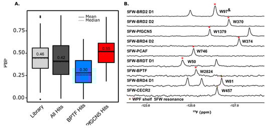 (A) Boxplot of the PBF of the library, total hits, and hits selective for BPTF and PfGCN5. (B) PrOF NMR overlay of various 5FW-labeled bromodomains. The W in the WPF shelf near the binding site is denoted with a red star and label. & The 5FW resonances have not been assigned but this W is the one that shows the largest response with known ligands [55]. Also see Figure S9.