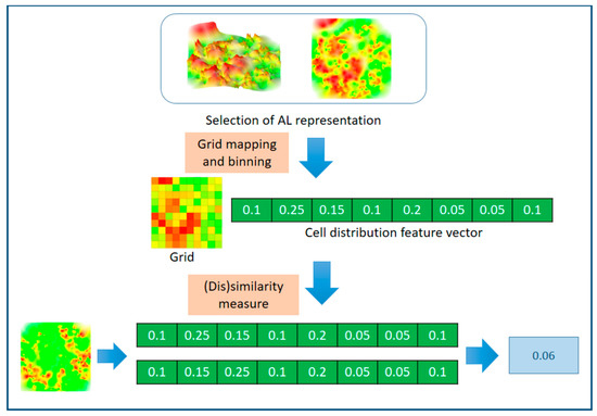Three-dimensional AL images embed topological features and color profiles, which are characterized by different color gradients resulting from potency value and compound similarity distributions (the combination of which determines AL topology). In heatmaps derived from 3D ALs, topological features and ensuing color gradients are encoded by color pixel intensities that can be algorithmically extracted. The basic premise underlying similarity-based comparison of 3D AL images, as introduced herein, is that scaled color pixel intensities can be quantitatively compared across different heatmaps. To this end, a common grid representation of heatmaps plays a central role. Using an evenly spaced grid, the heatmap is divided into a constant number of cells, which are assigned to different categories based upon color intensity threshold values. The distribution of cells over different categories is then quantitatively compared as a measure of AL (dis)similarity. Figure 1 illustrates the approach. Methodological and calculation details are provided in the Methods Section.