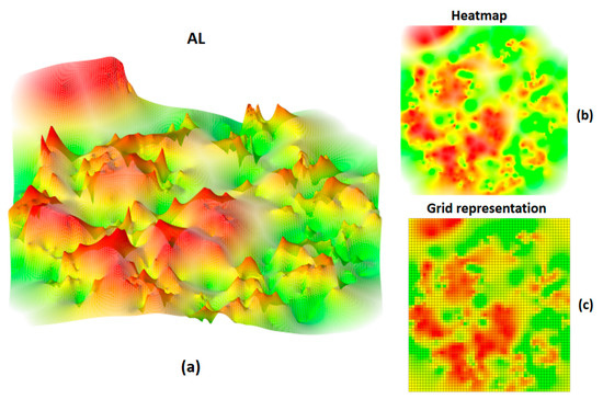 Conversion of 3D AL images into heatmaps established a reference frame for quantitative AL comparison. The heatmap corresponded to a top-down view of the color-coded 3D AL. Heatmaps were mapped onto an evenly spaced grid of dimensionality 56 × 60. Accordingly, each heatmap was divided into total 3360 cells. Figure 2 shows a 3D AL representation for a set of 673 corticotropin-releasing factor receptor 1 ligands, the corresponding heatmap, and its grid representation.